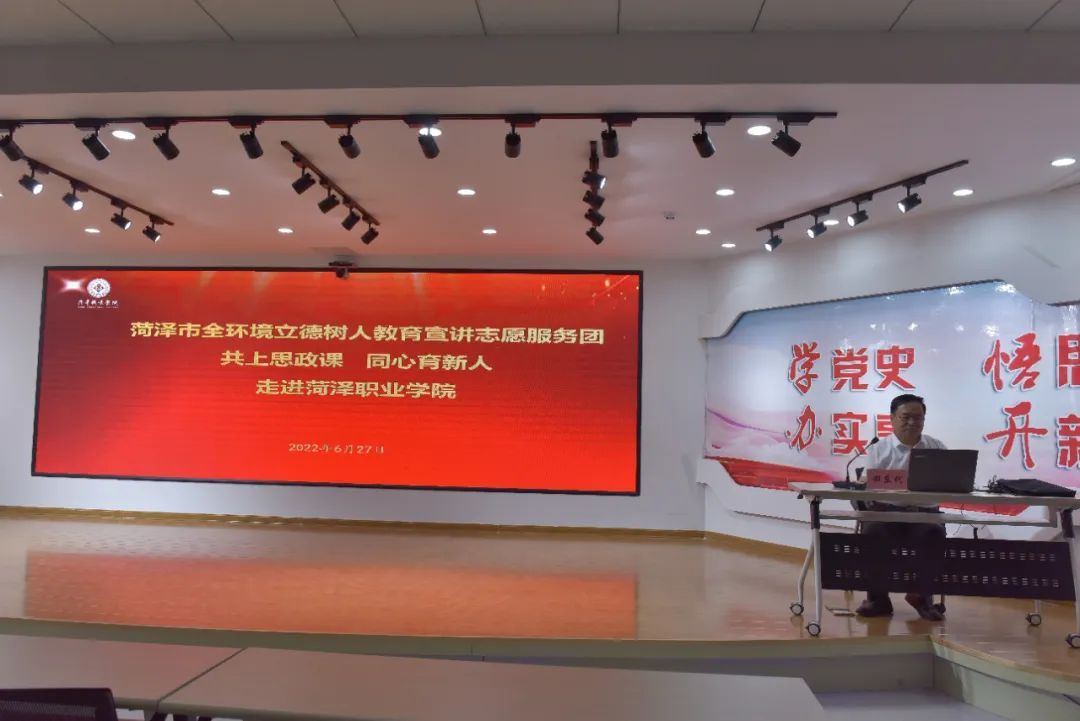 为深入推动习近平新时代中国特色社会主义思想进教材、进课堂、进学生头脑,落实立德树人根本任务,进一步增强学校思想政治理论课的针对性、实效性、吸引力,6月27日,菏泽市全环境立德树人教育宣讲志愿服务团走进3200威尼斯vip,开展“共上思政课、同心育新人”活动。3200威尼斯vip副院长陈俊启,宣传部部长周世竞、质量监控处处长刘秀斌出席,我院部分教师代表参加了本次讲座。讲座由陈俊启主持。