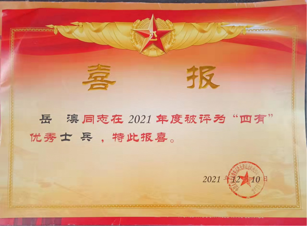 入伍后,岳澳牢记学校老师和父母的嘱托,刻苦训练、拼搏进取、勇于挑战,圆满完成了各项任务,获得部队领导和战友的一致好评,最终获此殊荣。